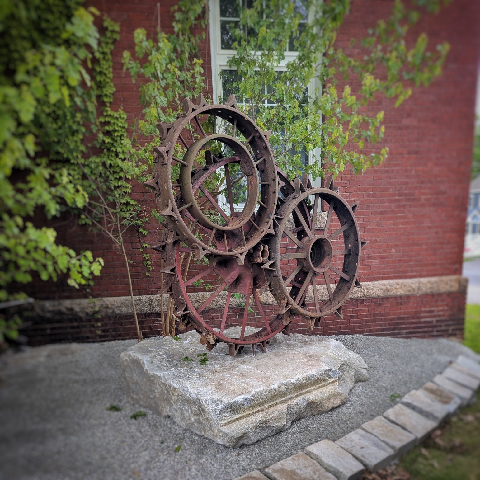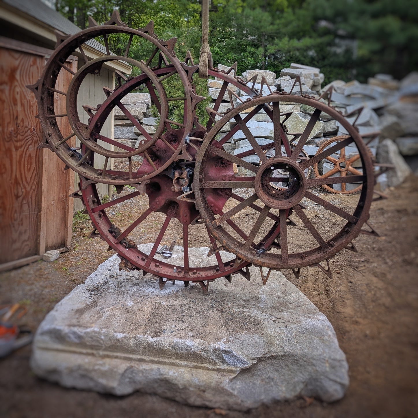 Three antique tractor wheels mounted on a reclaimed granite landing sourced from Maine