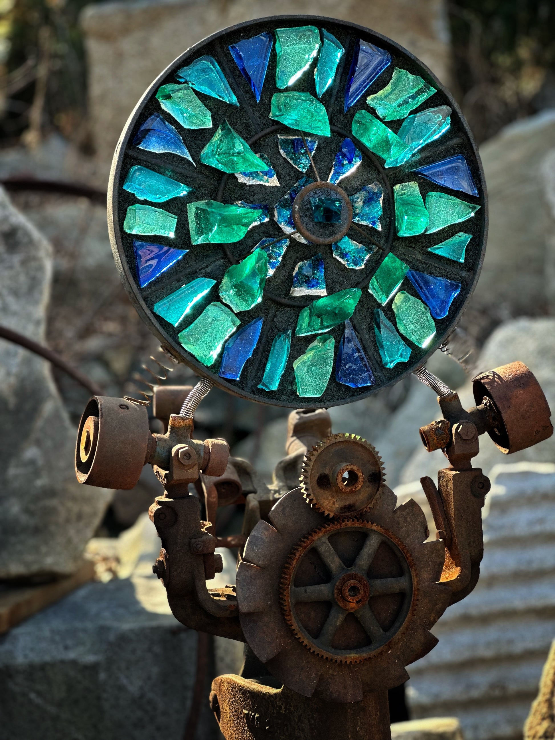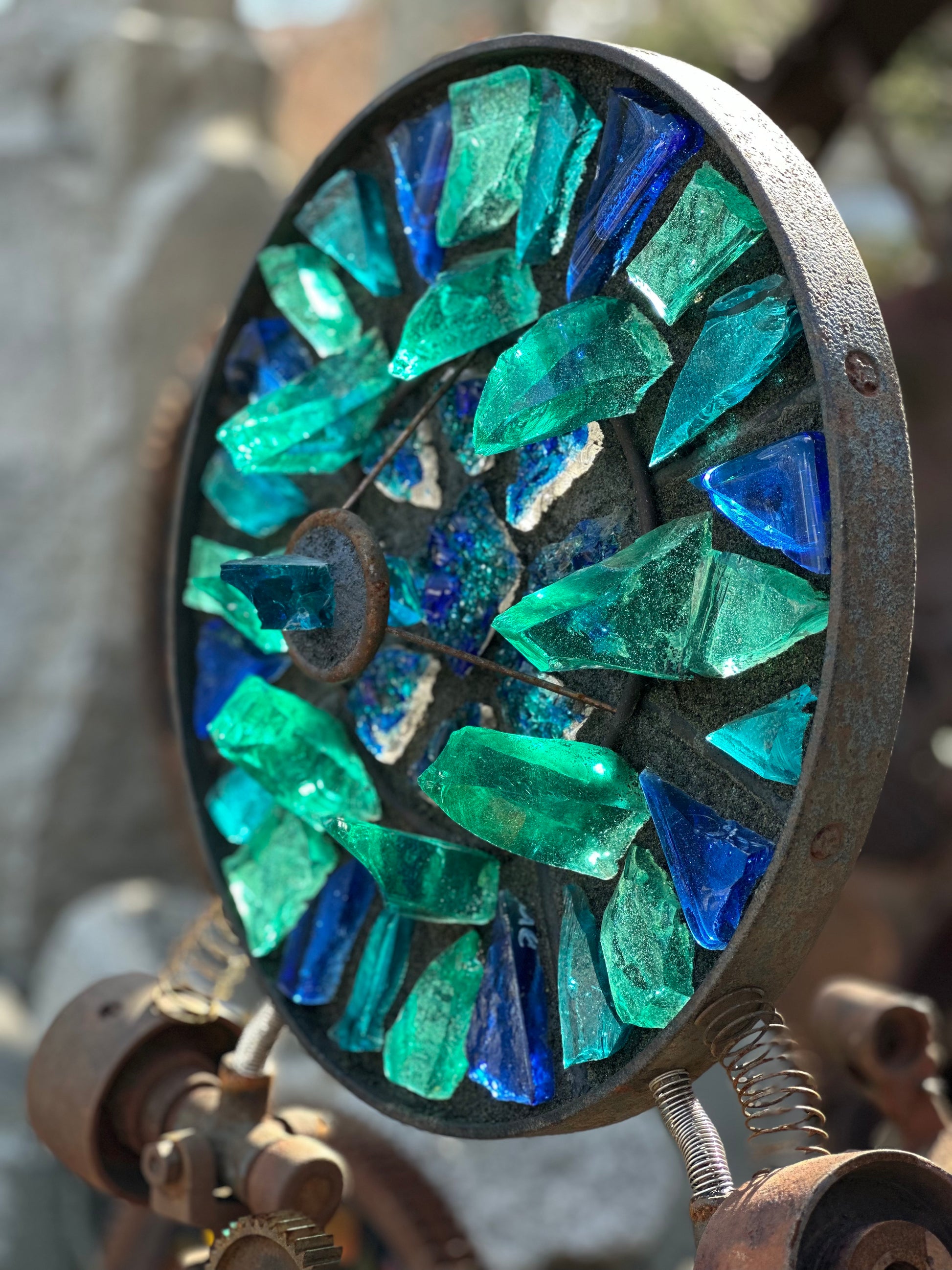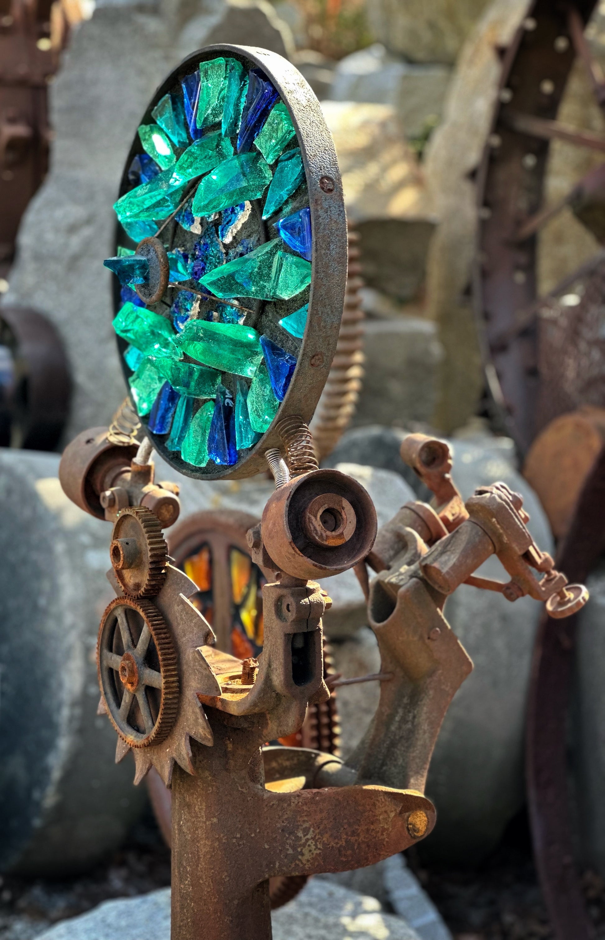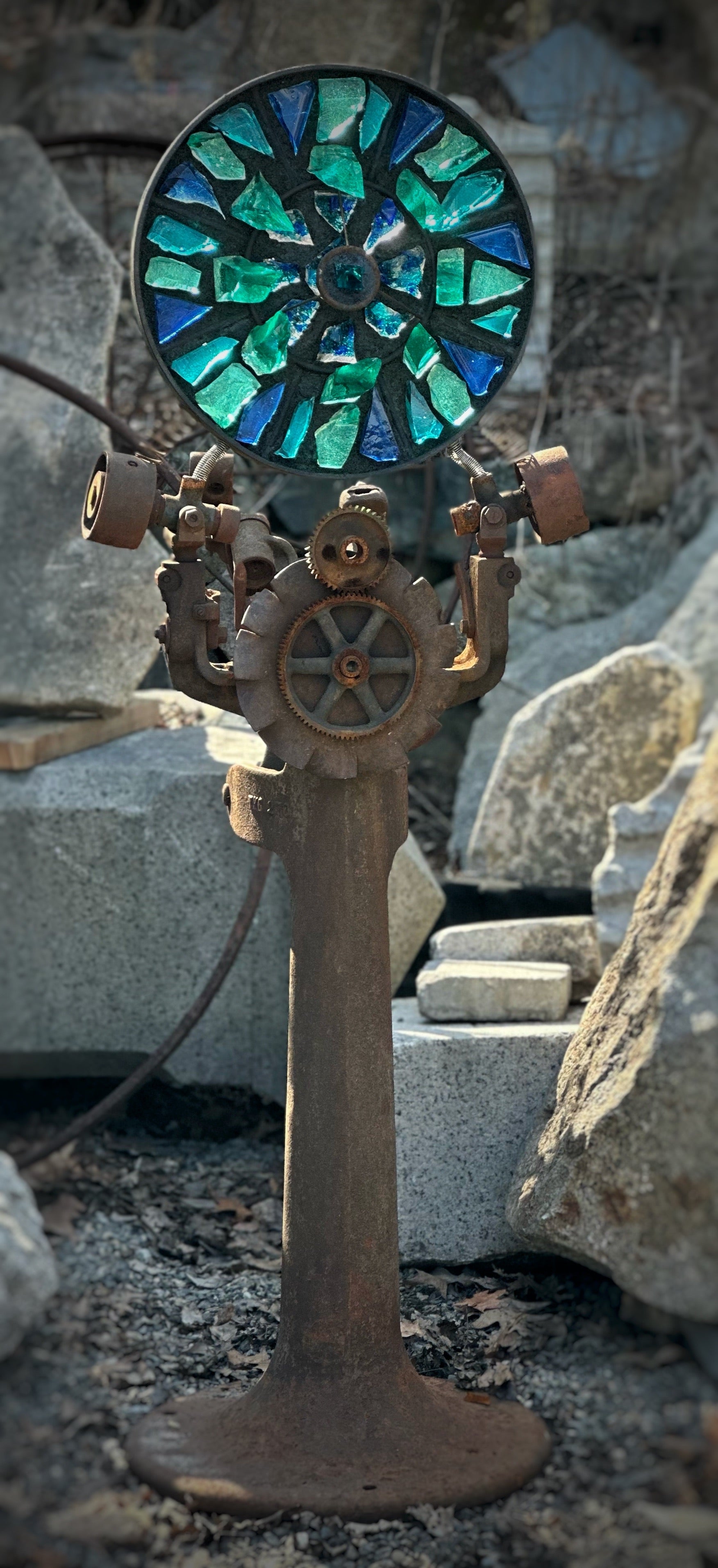 Antique skate sharpening machine embellised with an antique steel wheel inlaid with dalle de verre art glass in shades of blue green, mounted on a reclaimed granite pedestal