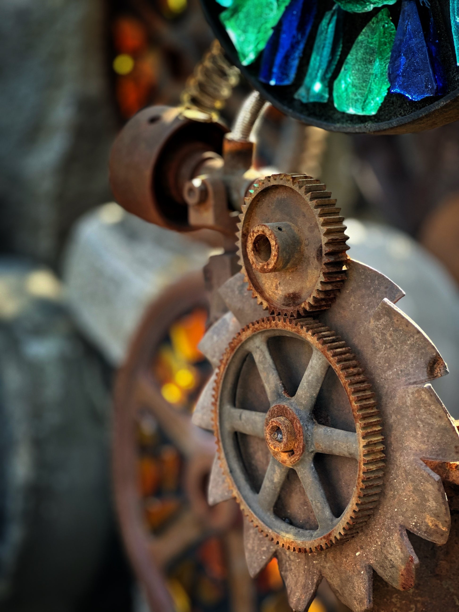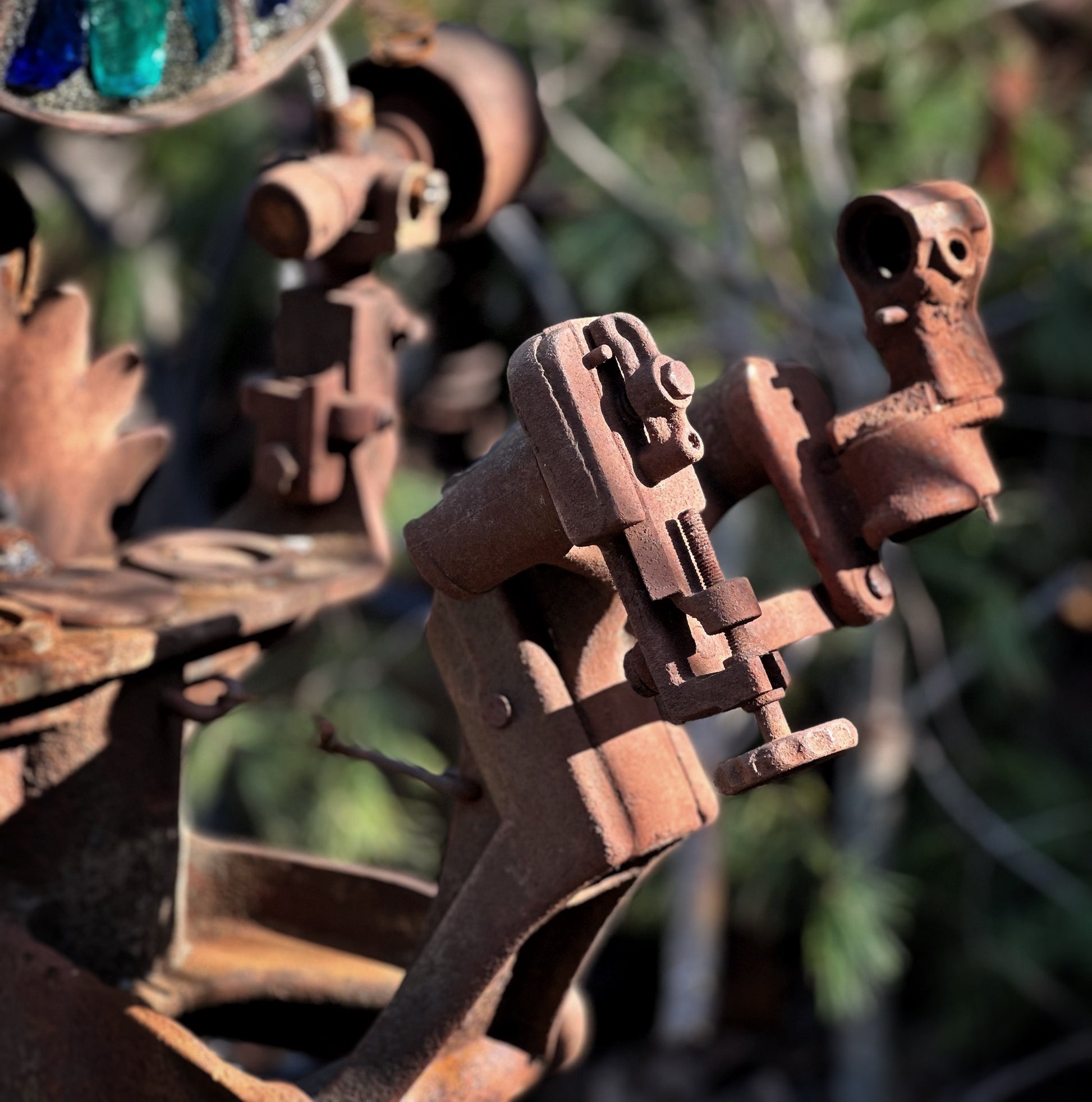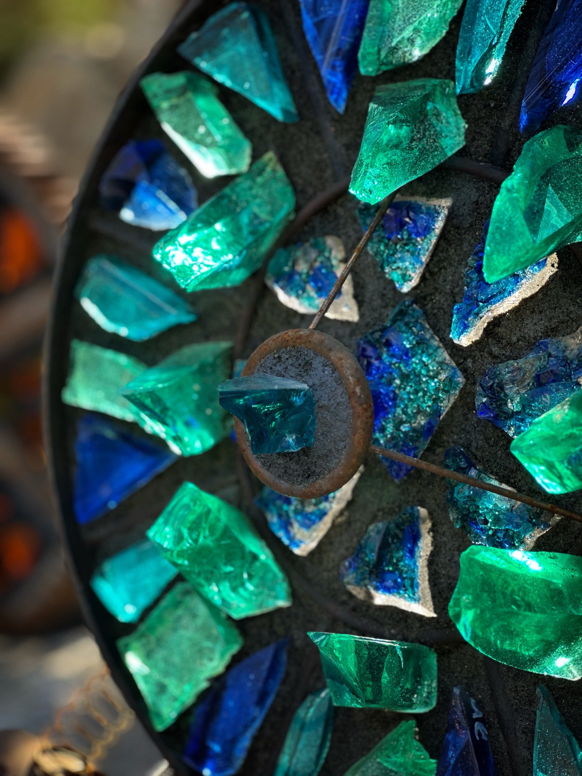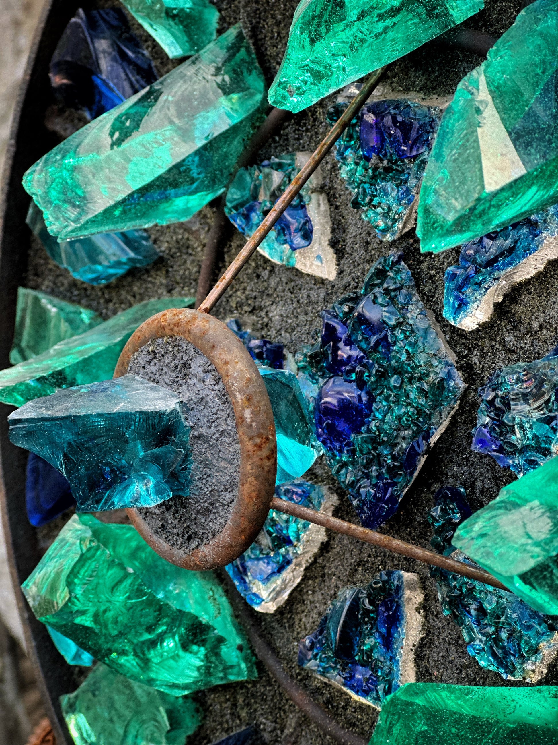 Antique skate sharpening machine embellised with an antique steel wheel inlaid with dalle de verre art glass in shades of blue green, mounted on a reclaimed granite pedestal