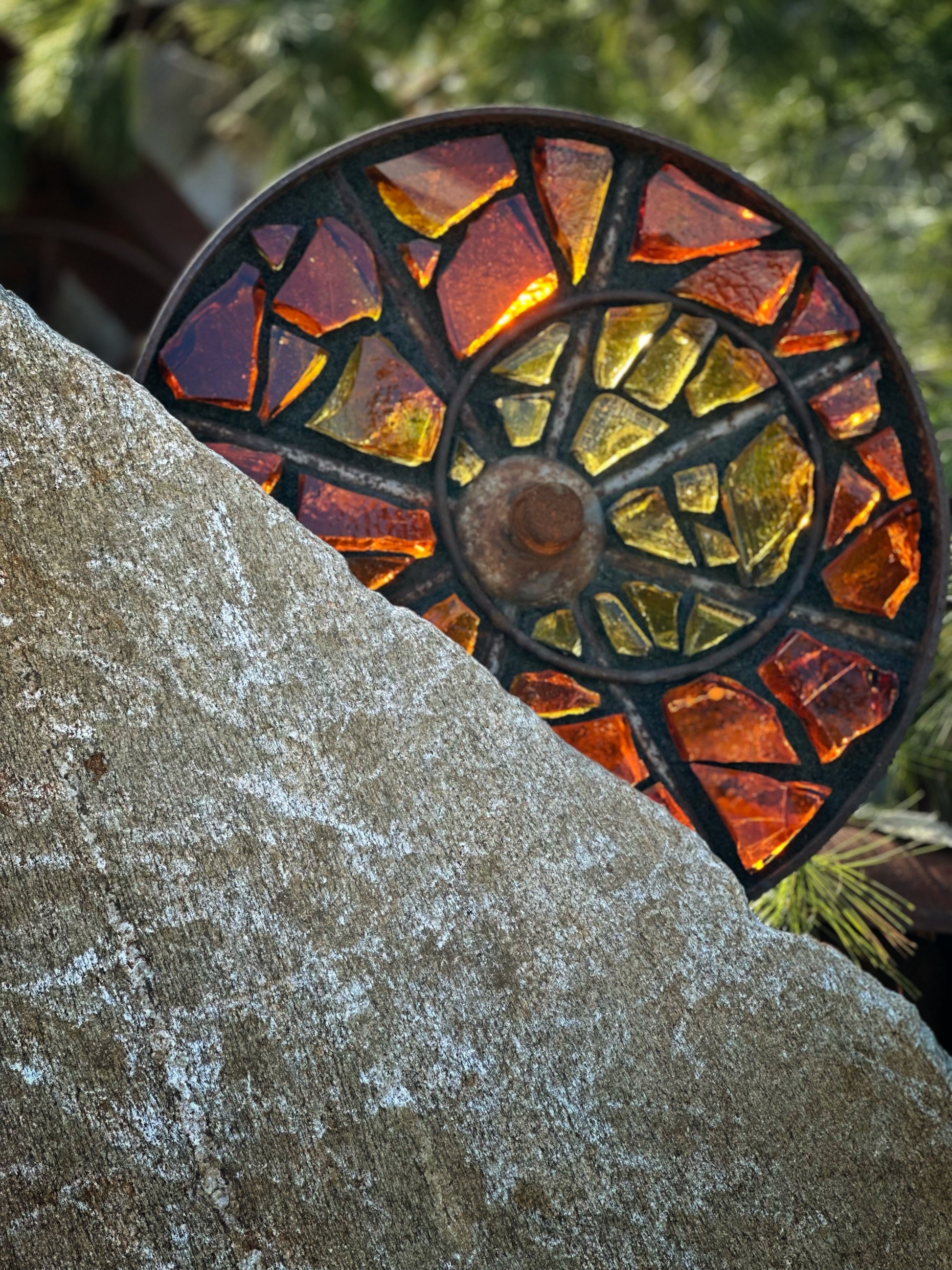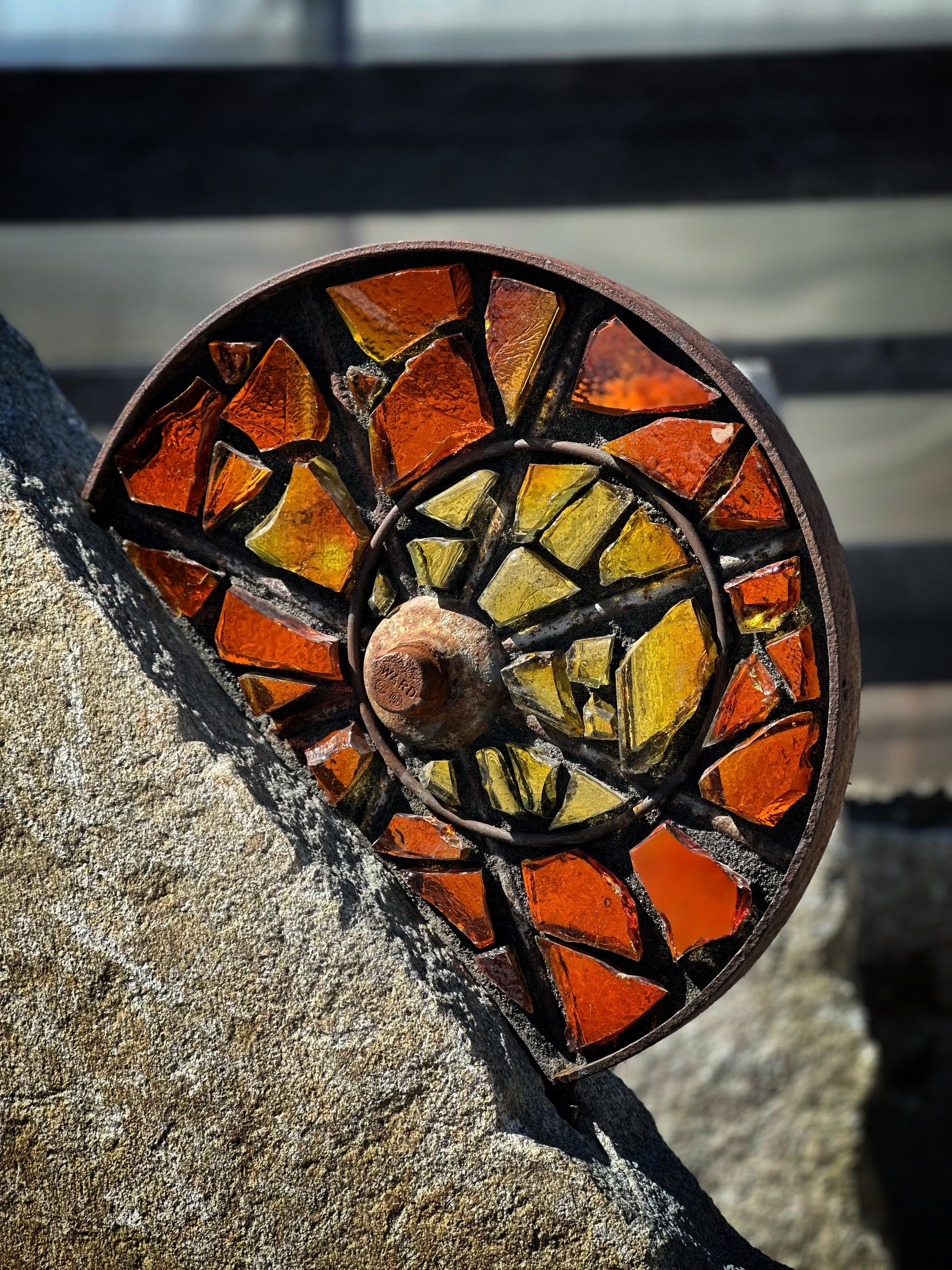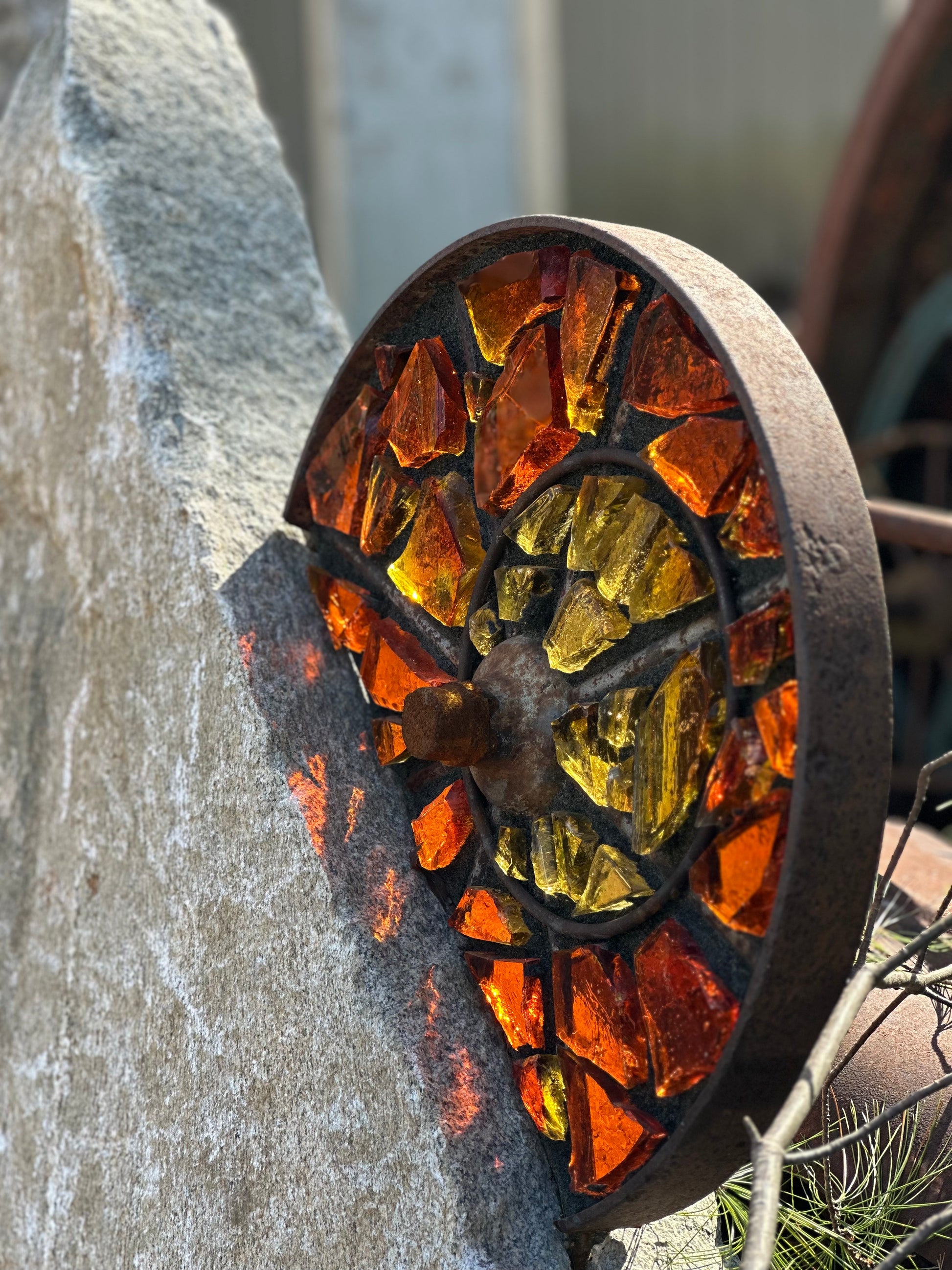 Antique custom cut steel wheel inlaid with yellow and amber dalle de verre art glass and mounted on a reclaimed granite pedestal sourced in Maine