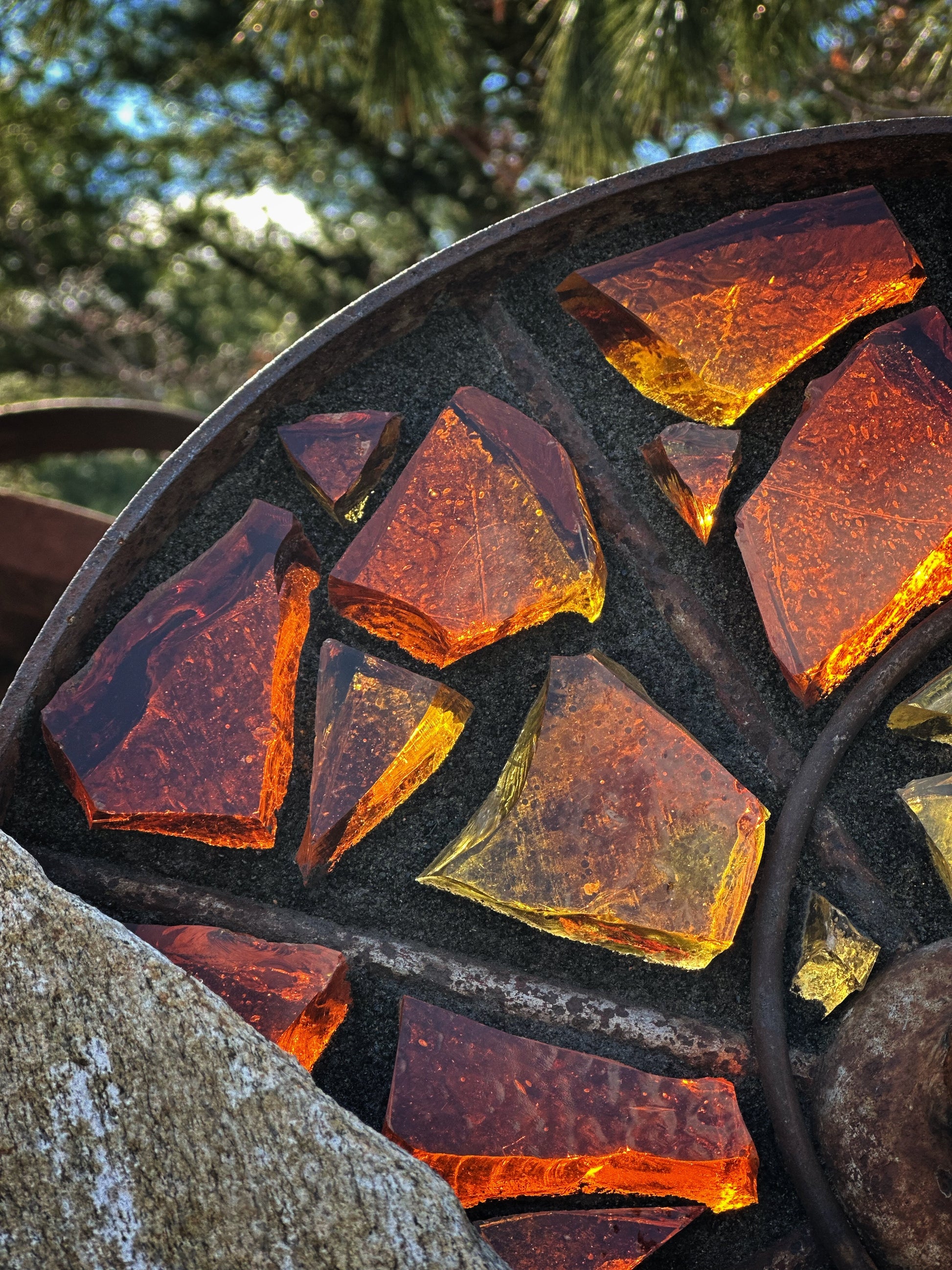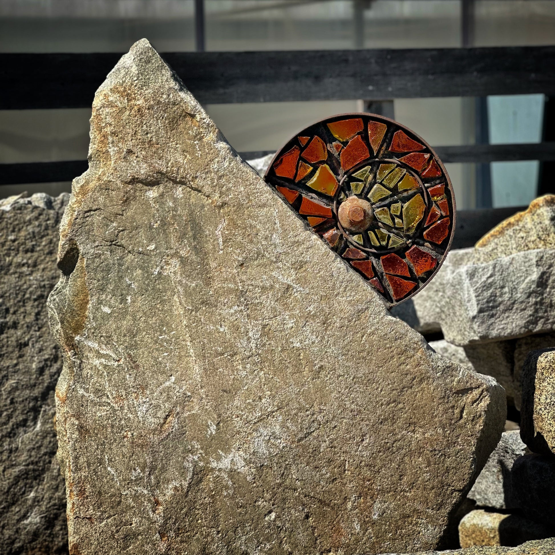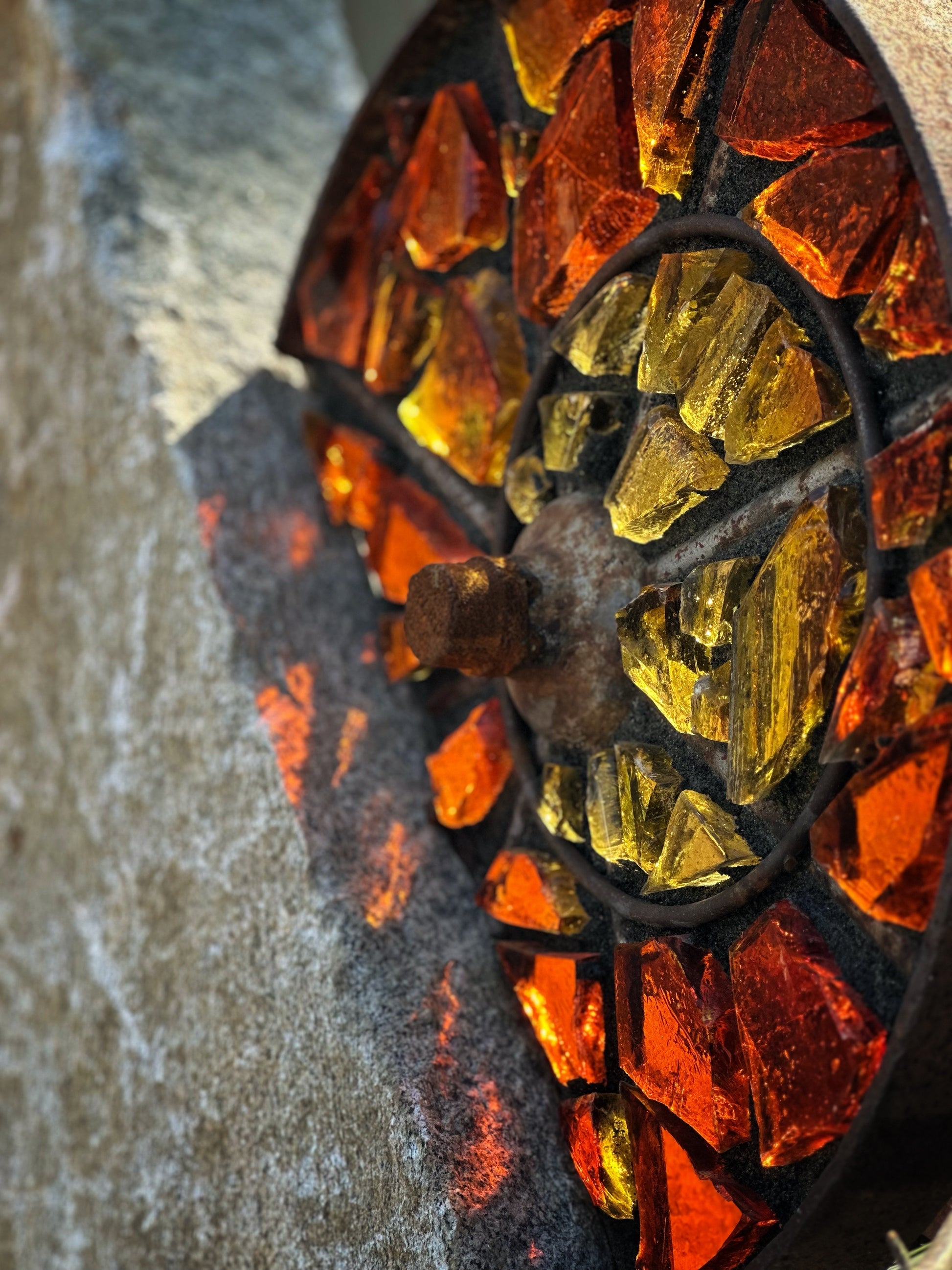 Antique custom cut steel wheel inlaid with yellow and amber dalle de verre art glass and mounted on a reclaimed granite pedestal sourced in Maine
