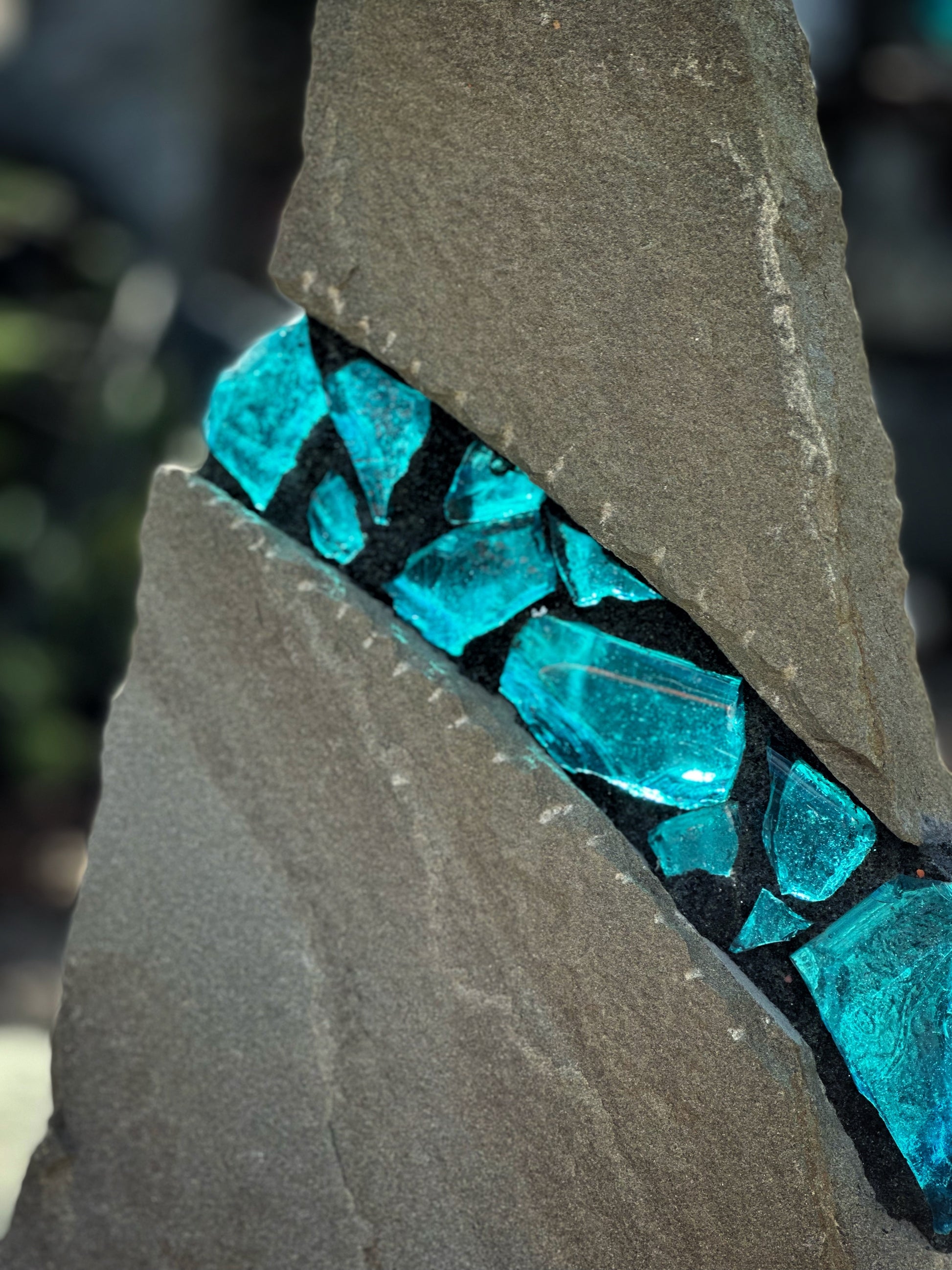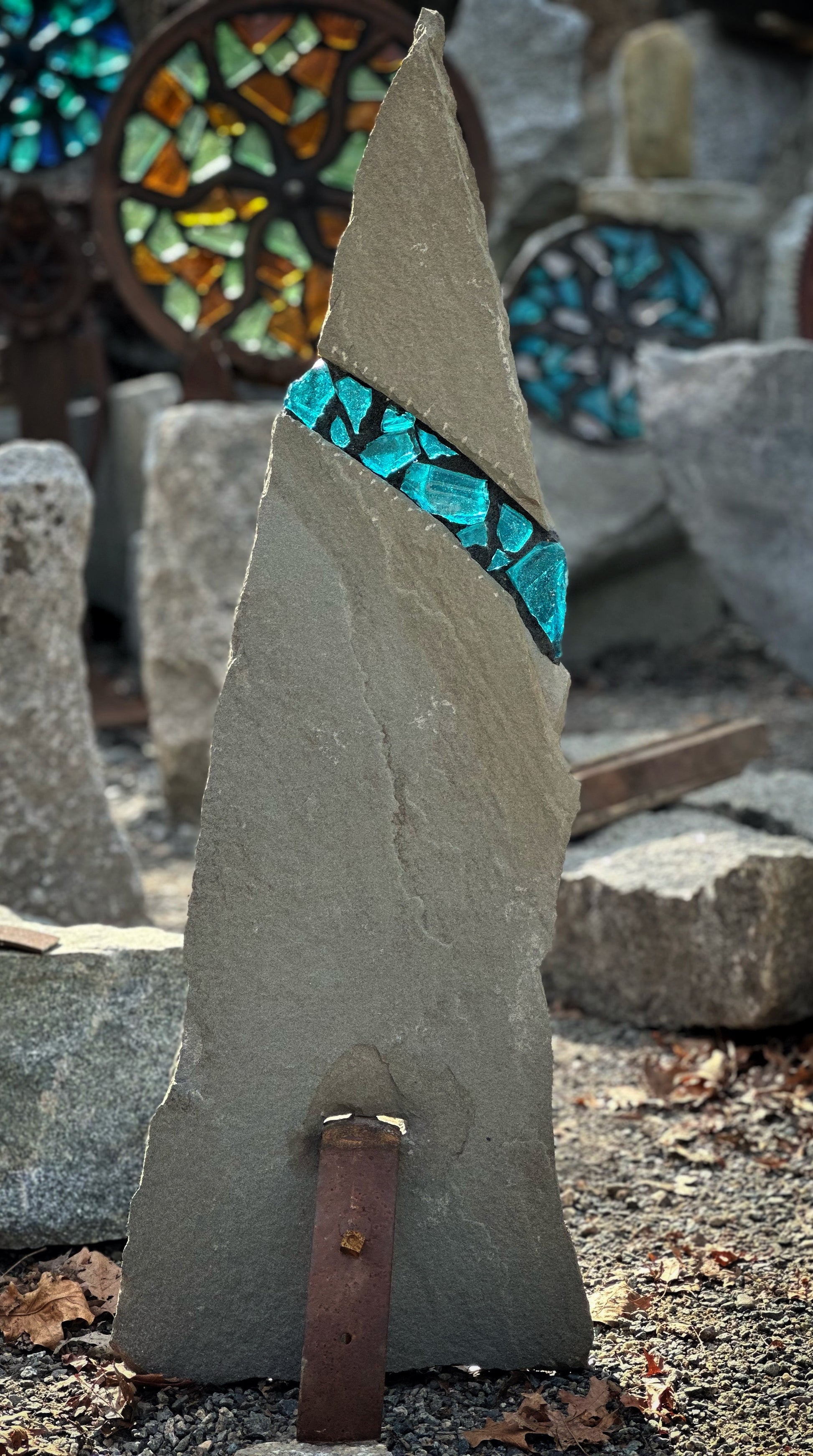 Standing piece of bluestone bisected with inlaid aquamarine dalle de verre art glass and supported by antique steel wheel stand