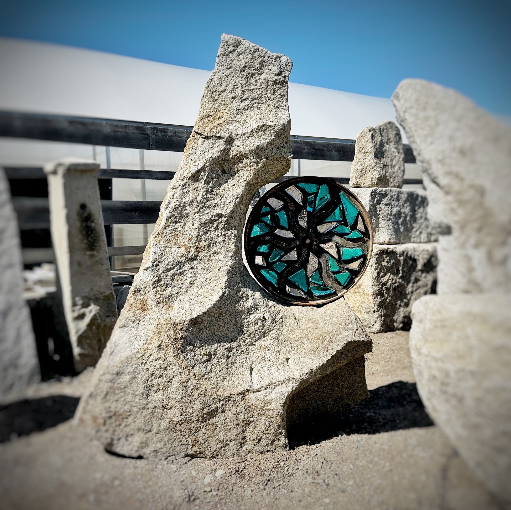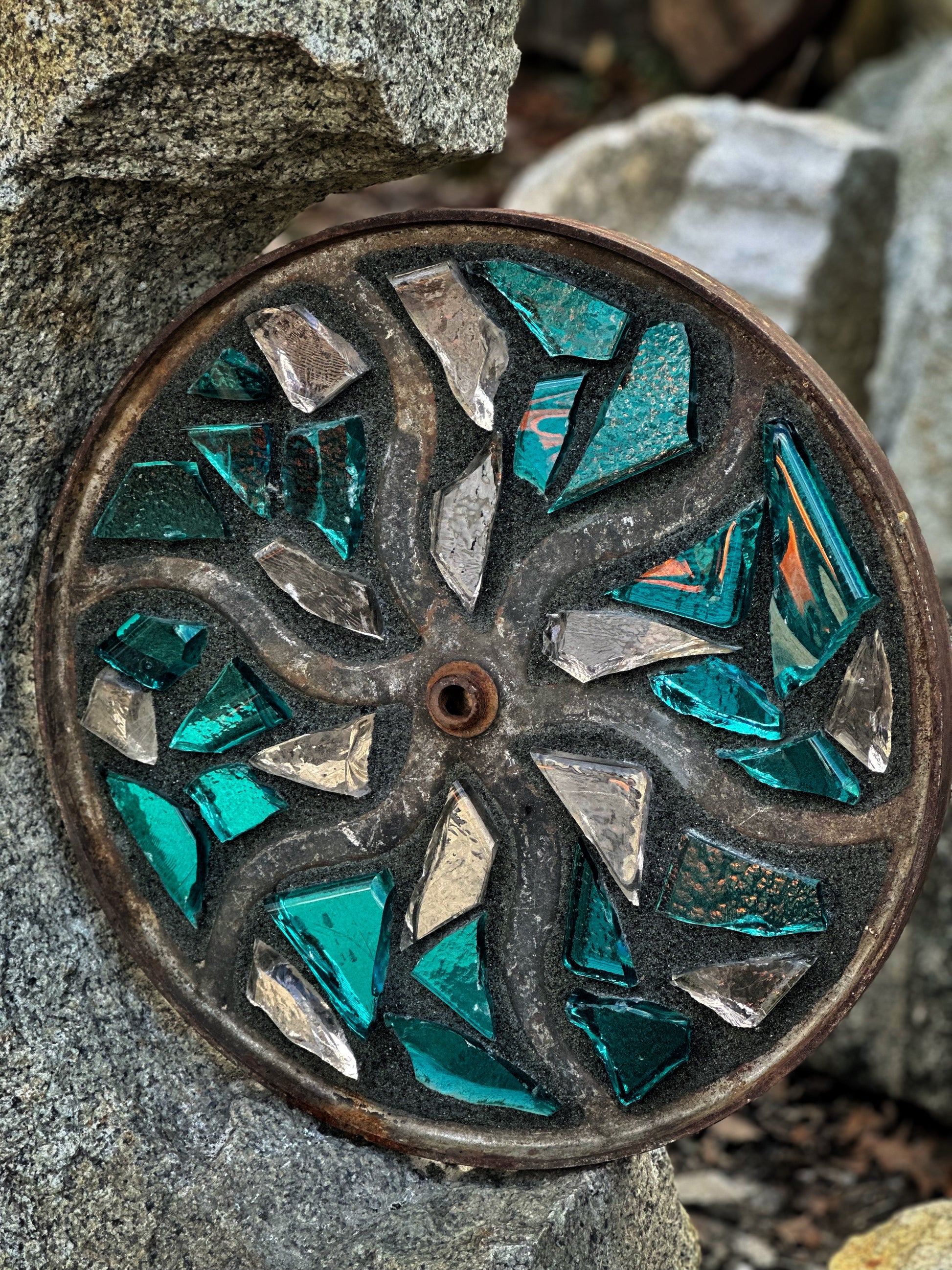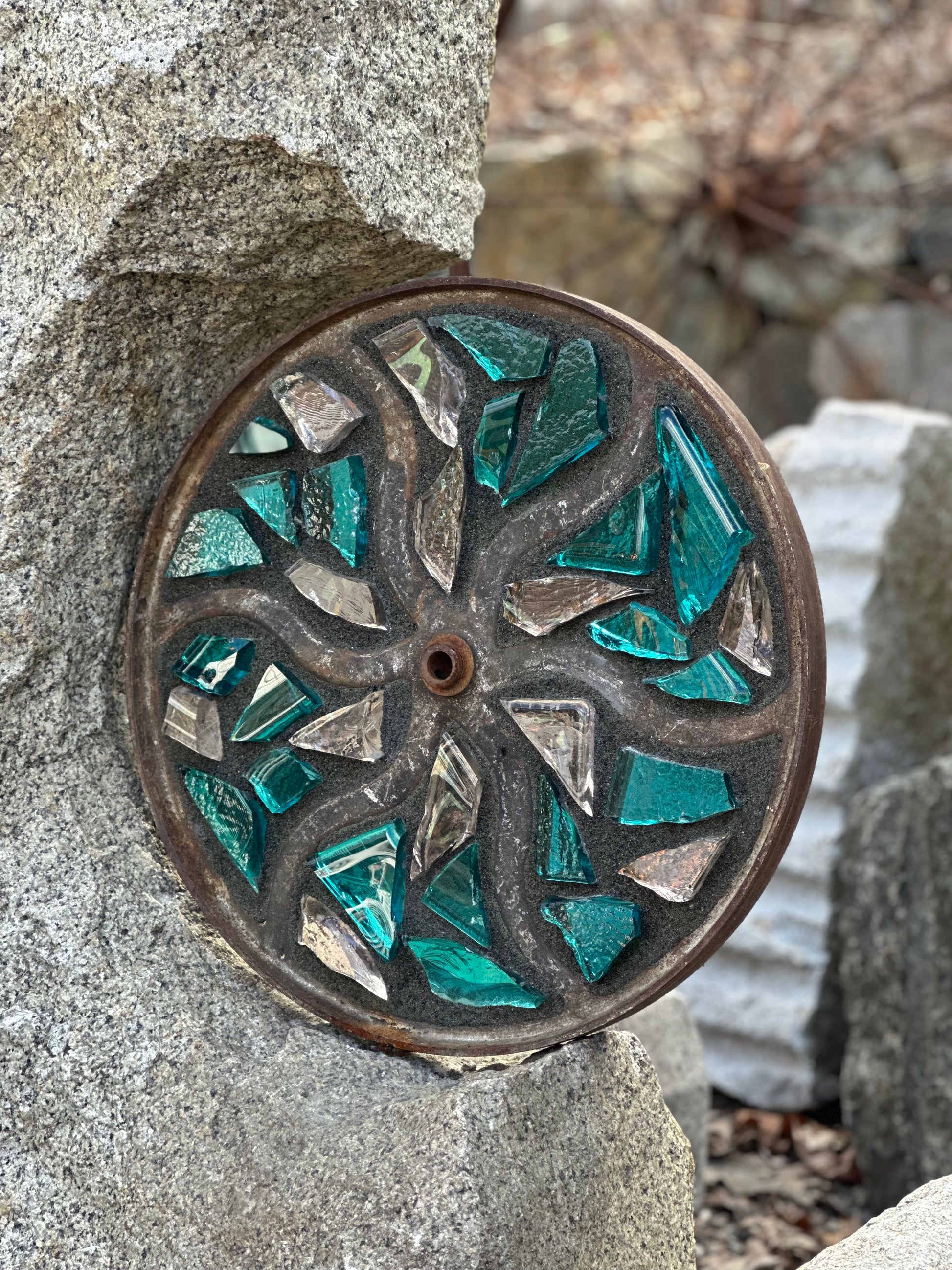 Antique granite well cover standing stone inset with vintage steel well inlaid with blue and silver dalle de verre art glass