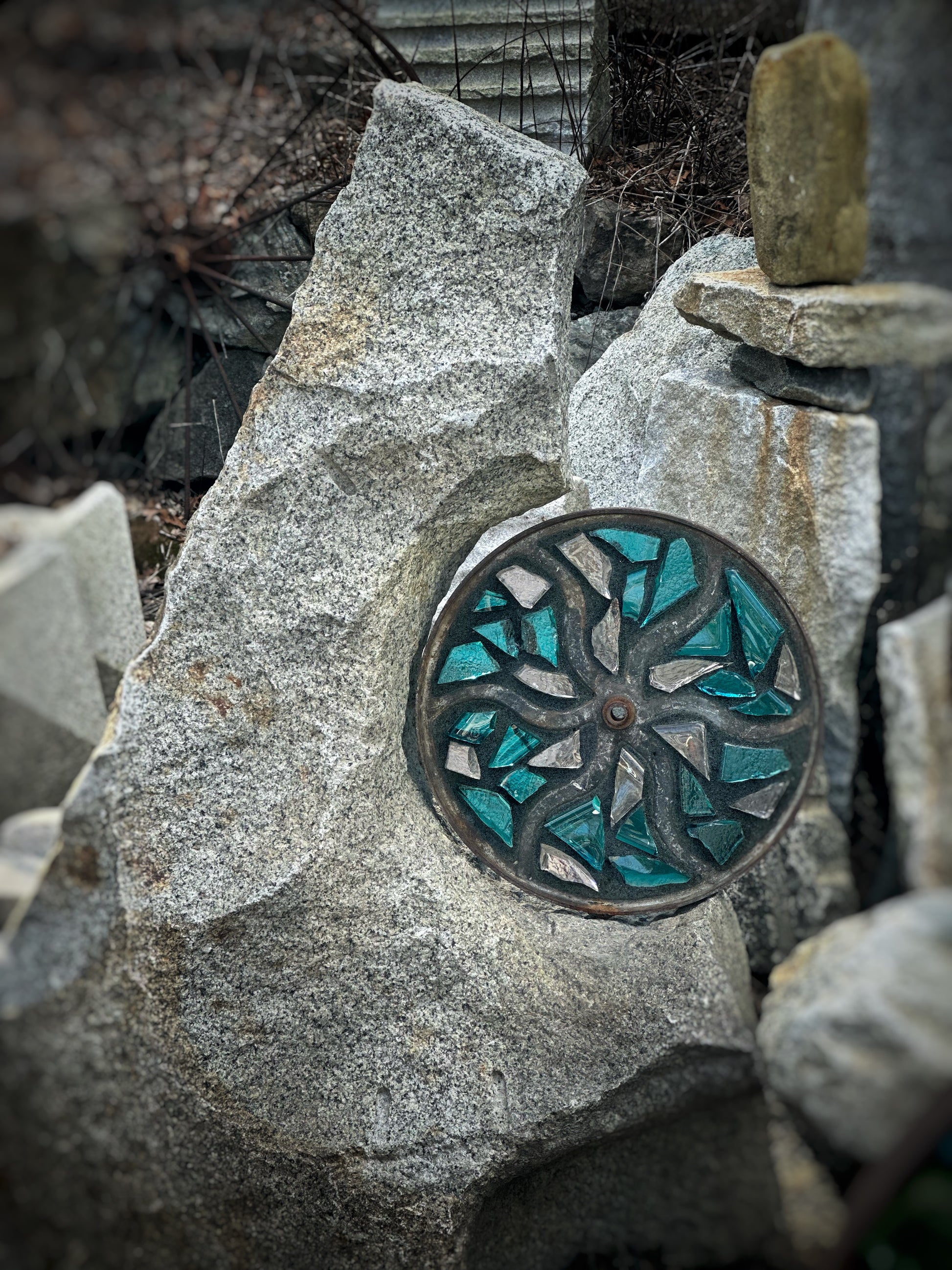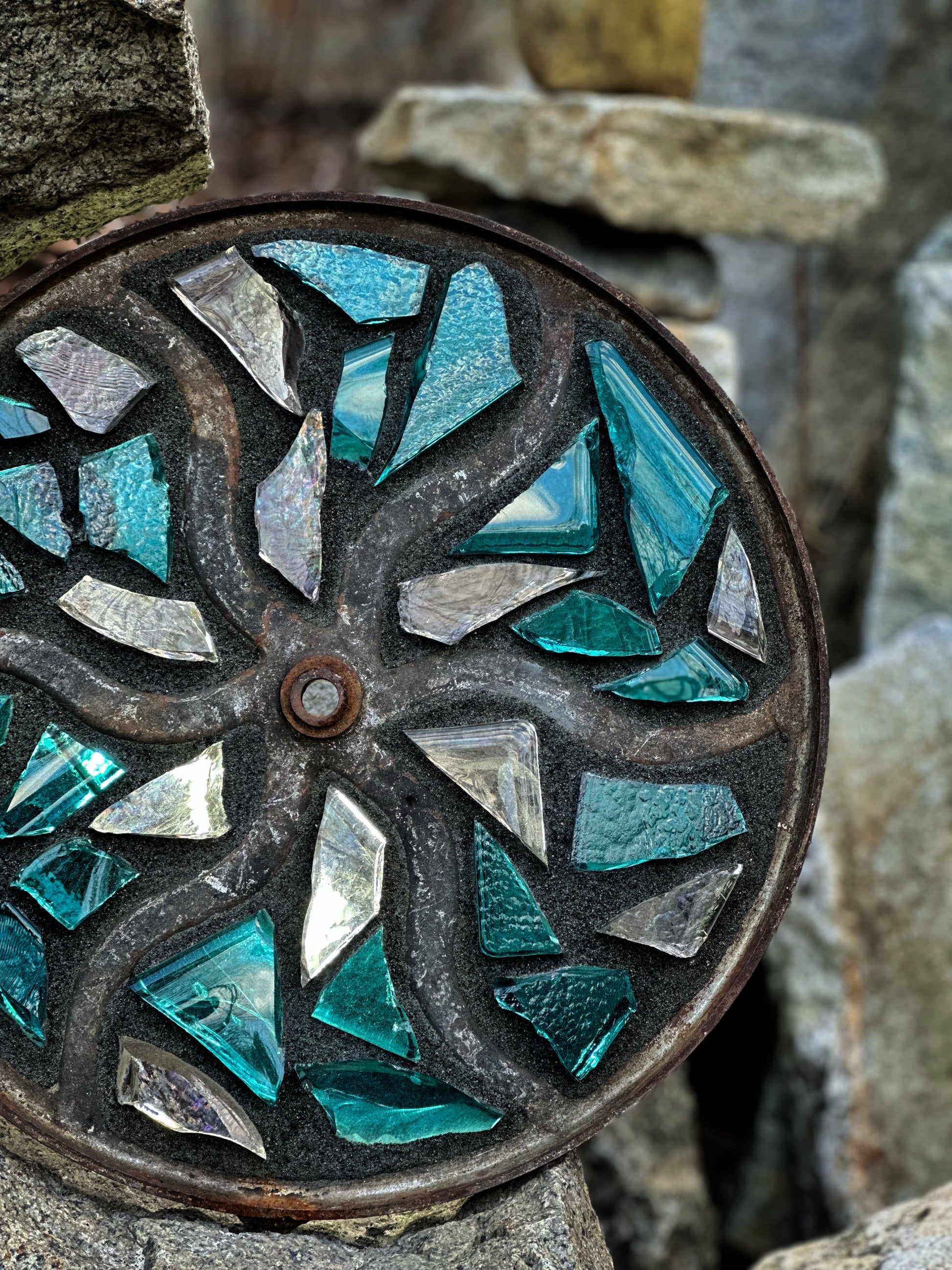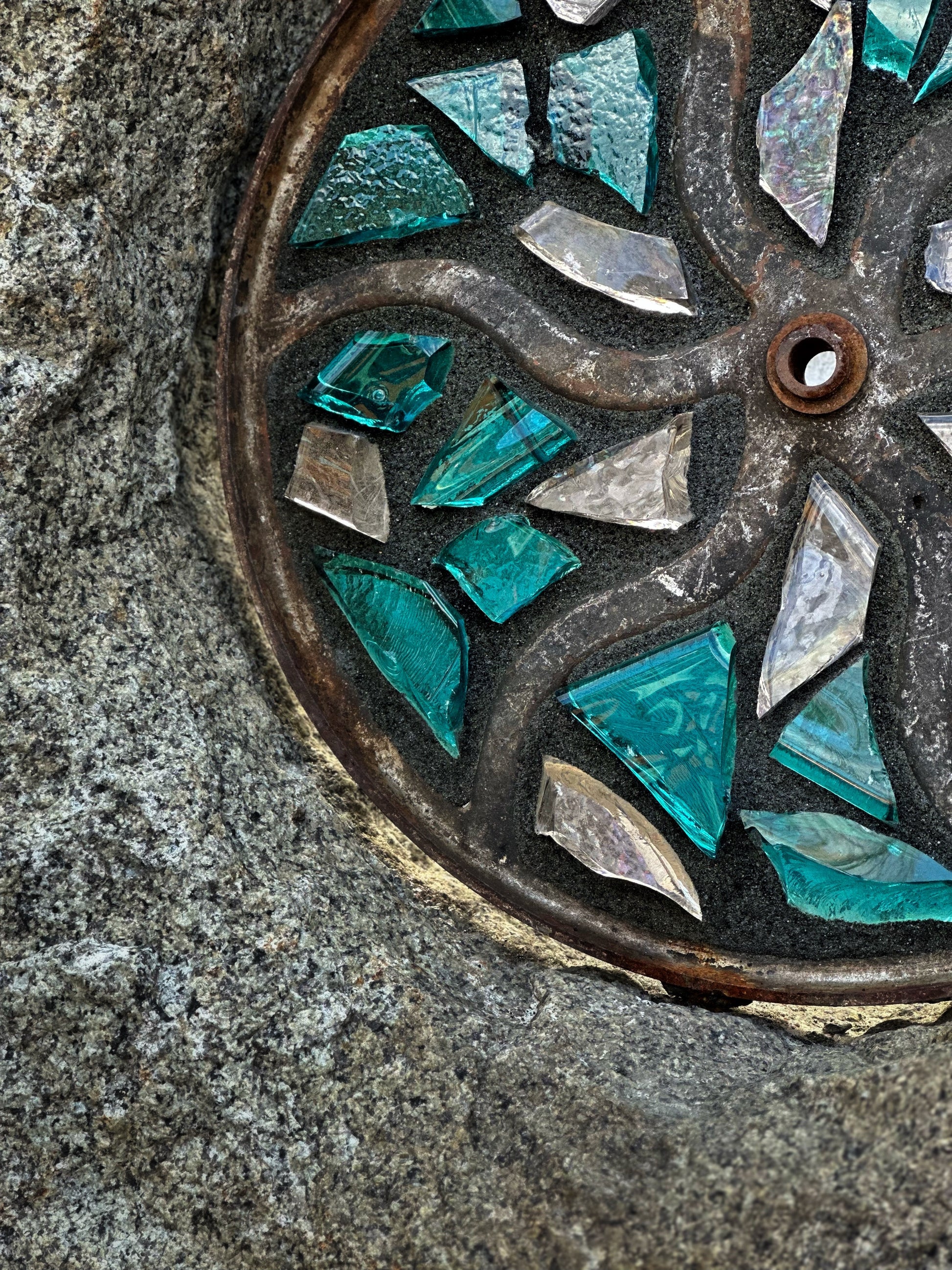 Antique granite well cover standing stone inset with vintage steel well inlaid with blue and silver dalle de verre art glass