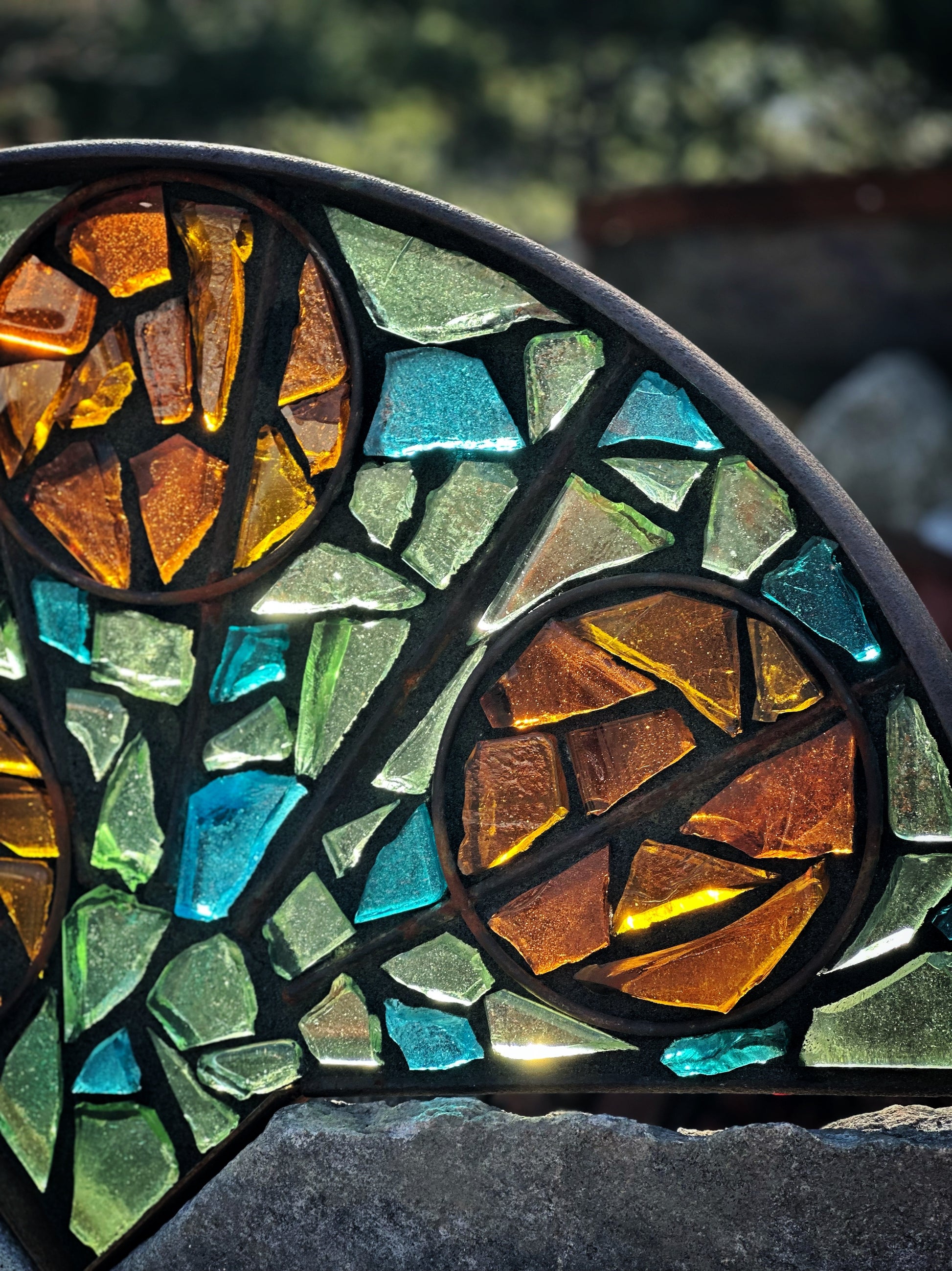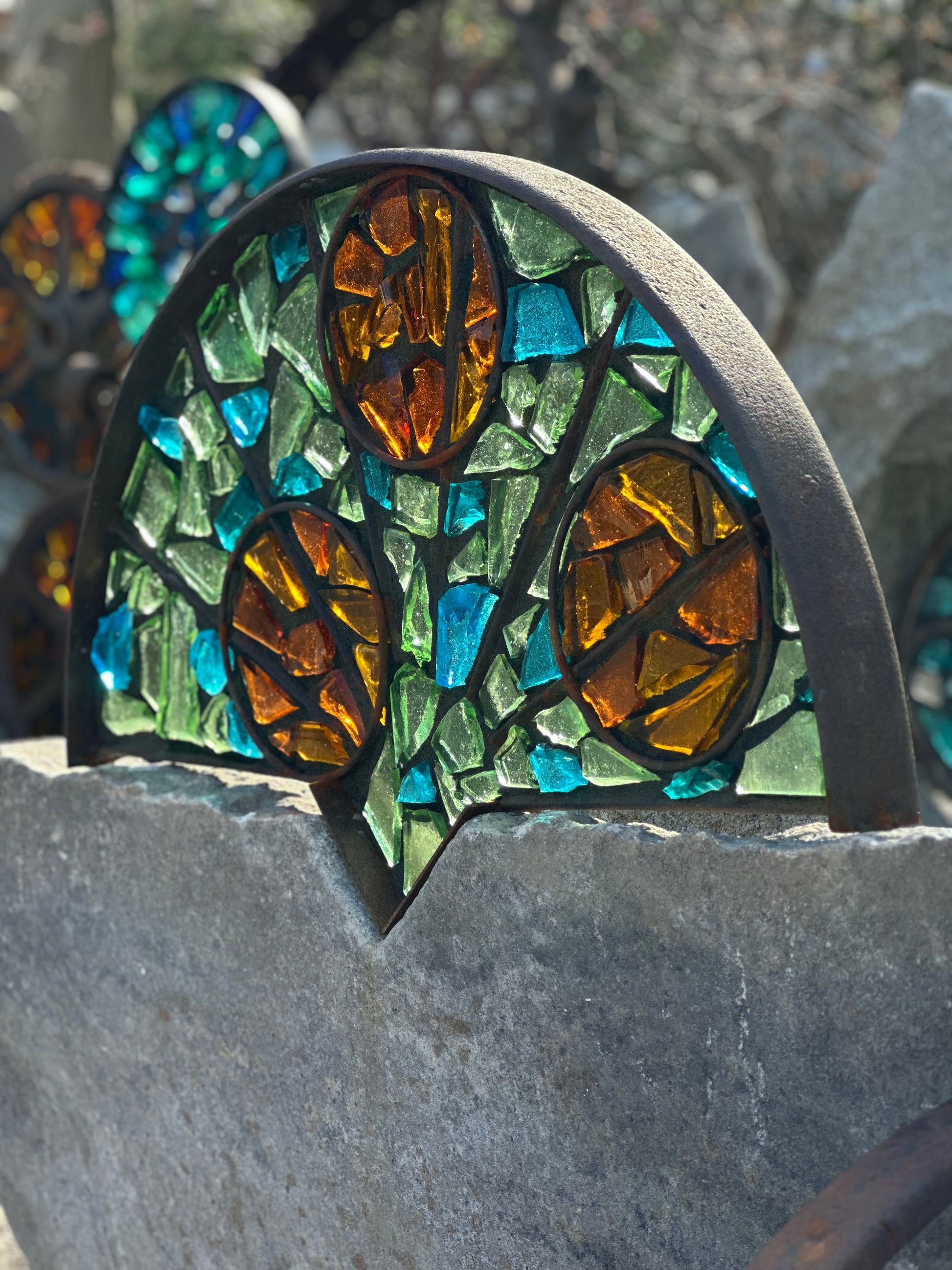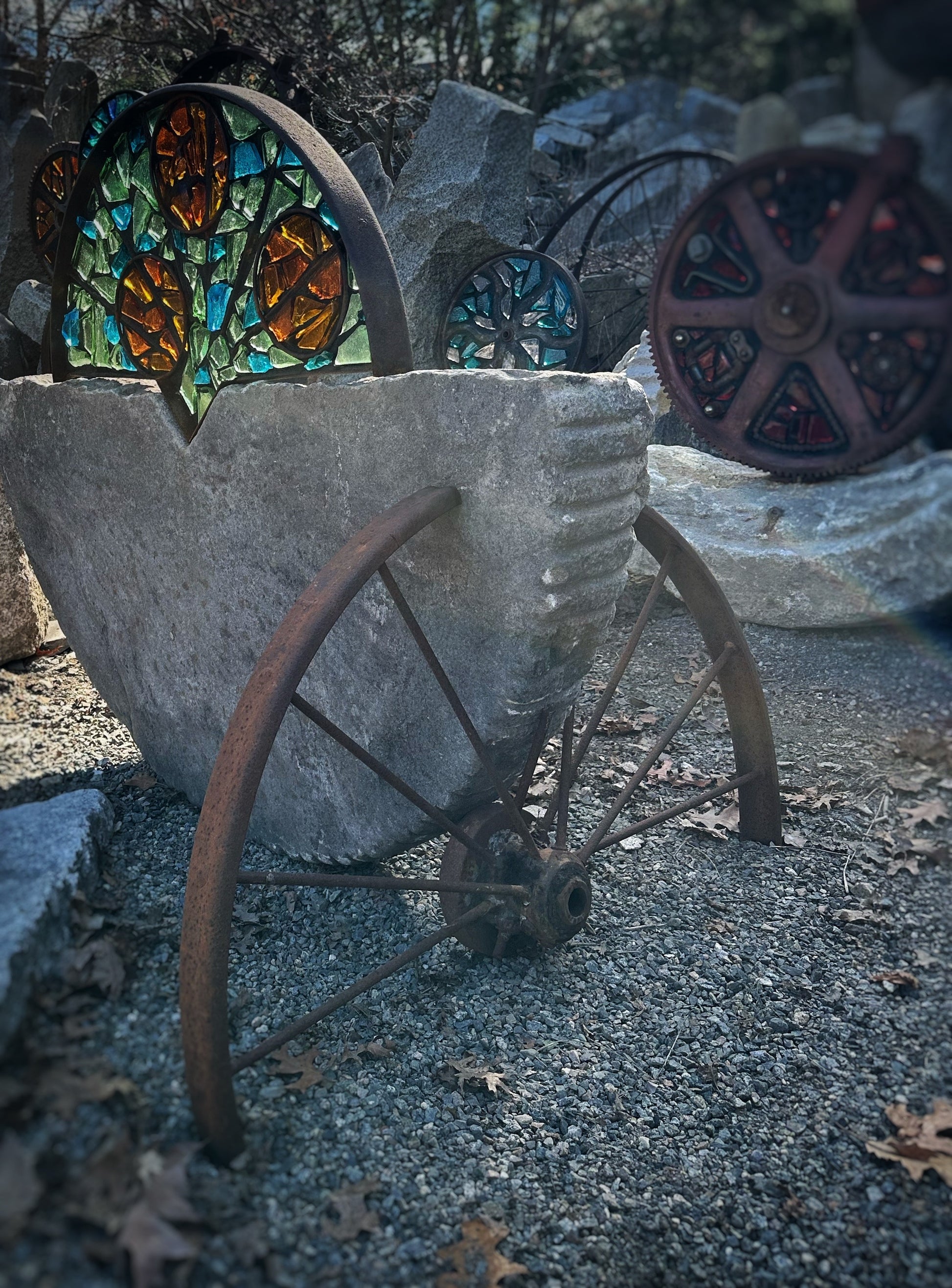 Half of an antique stone mill wheel embellished with multi-color dalle de verre art glass in a custom frame made of vintage steel, additional antique wheel serves as stand