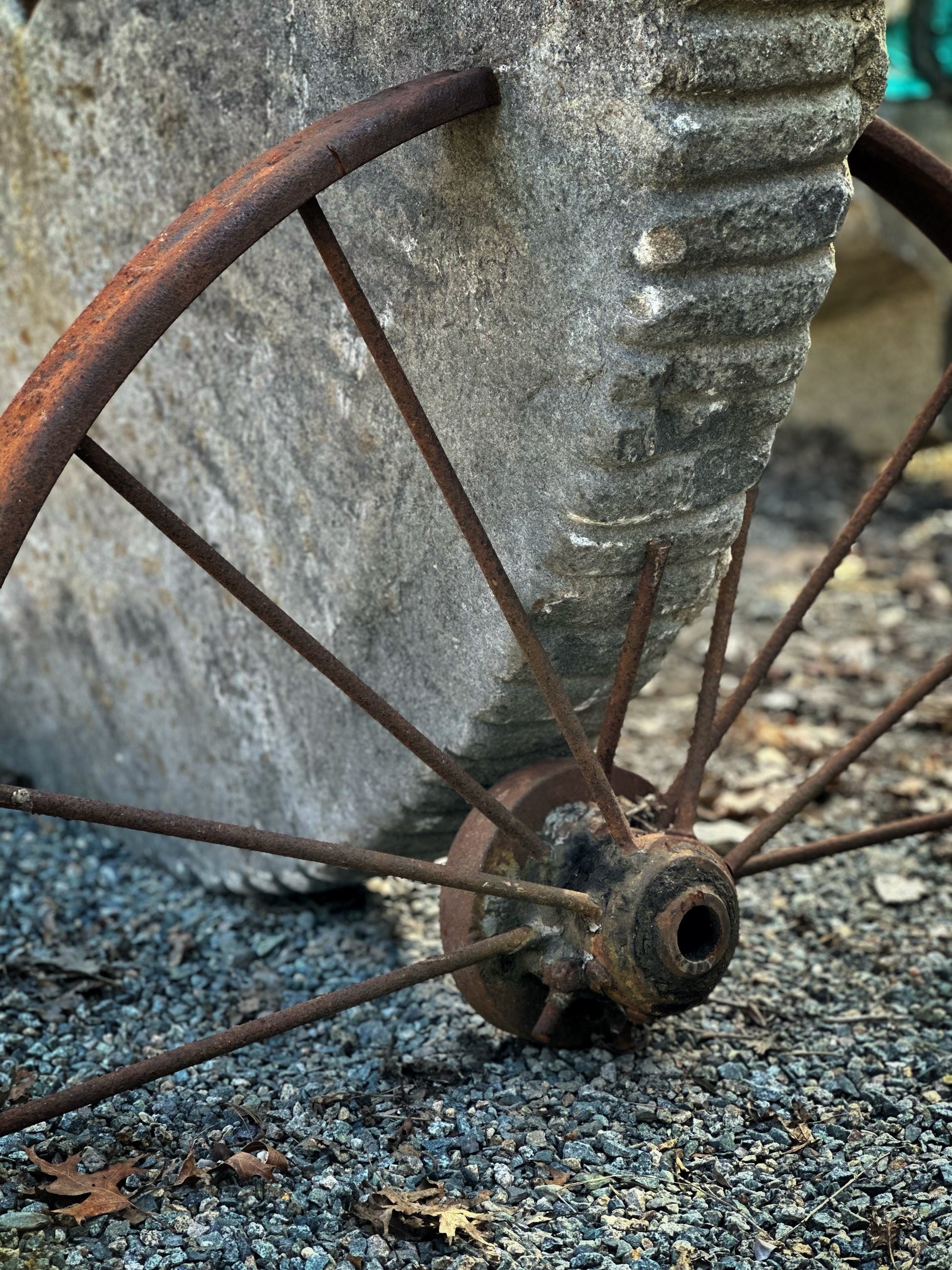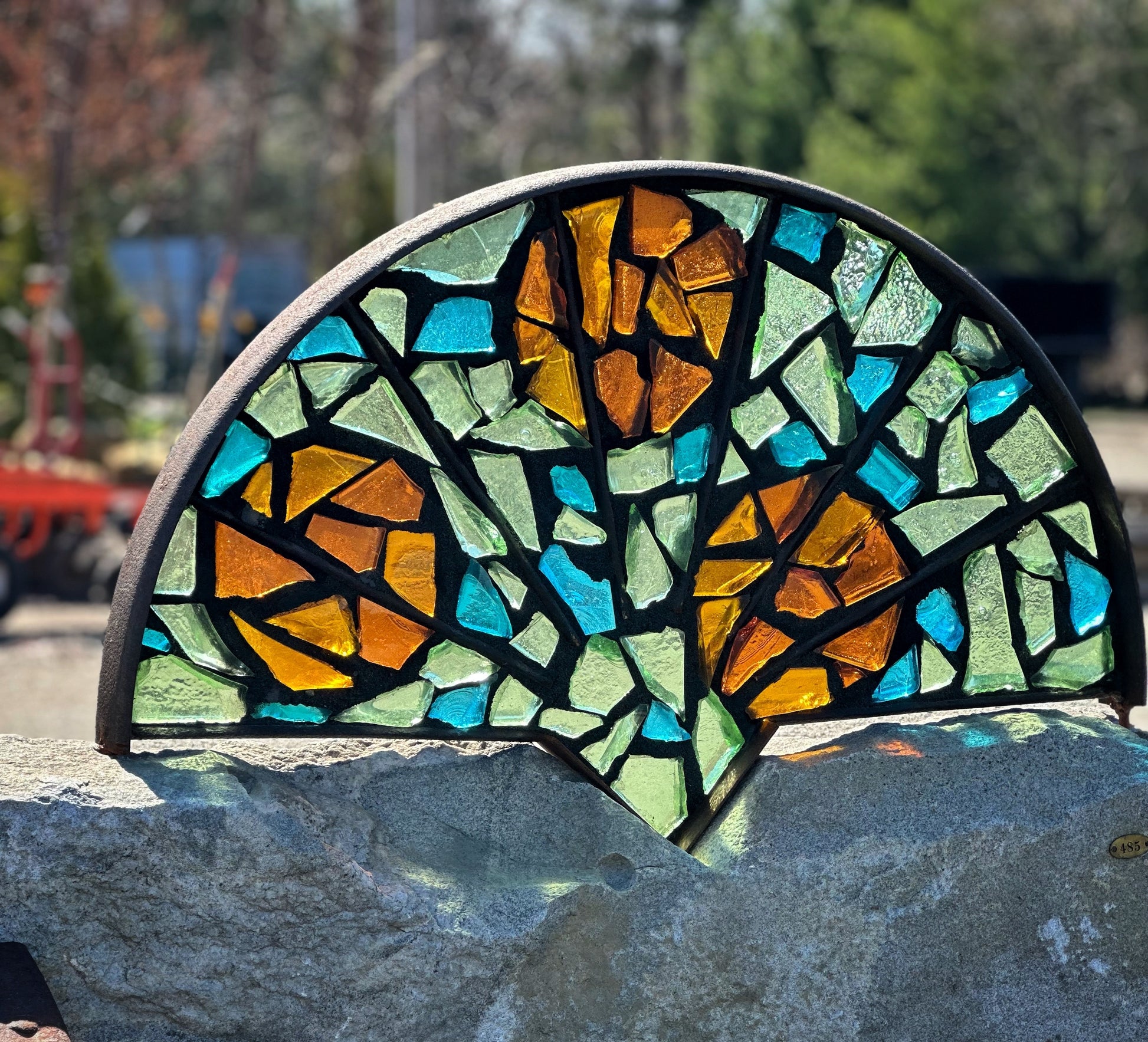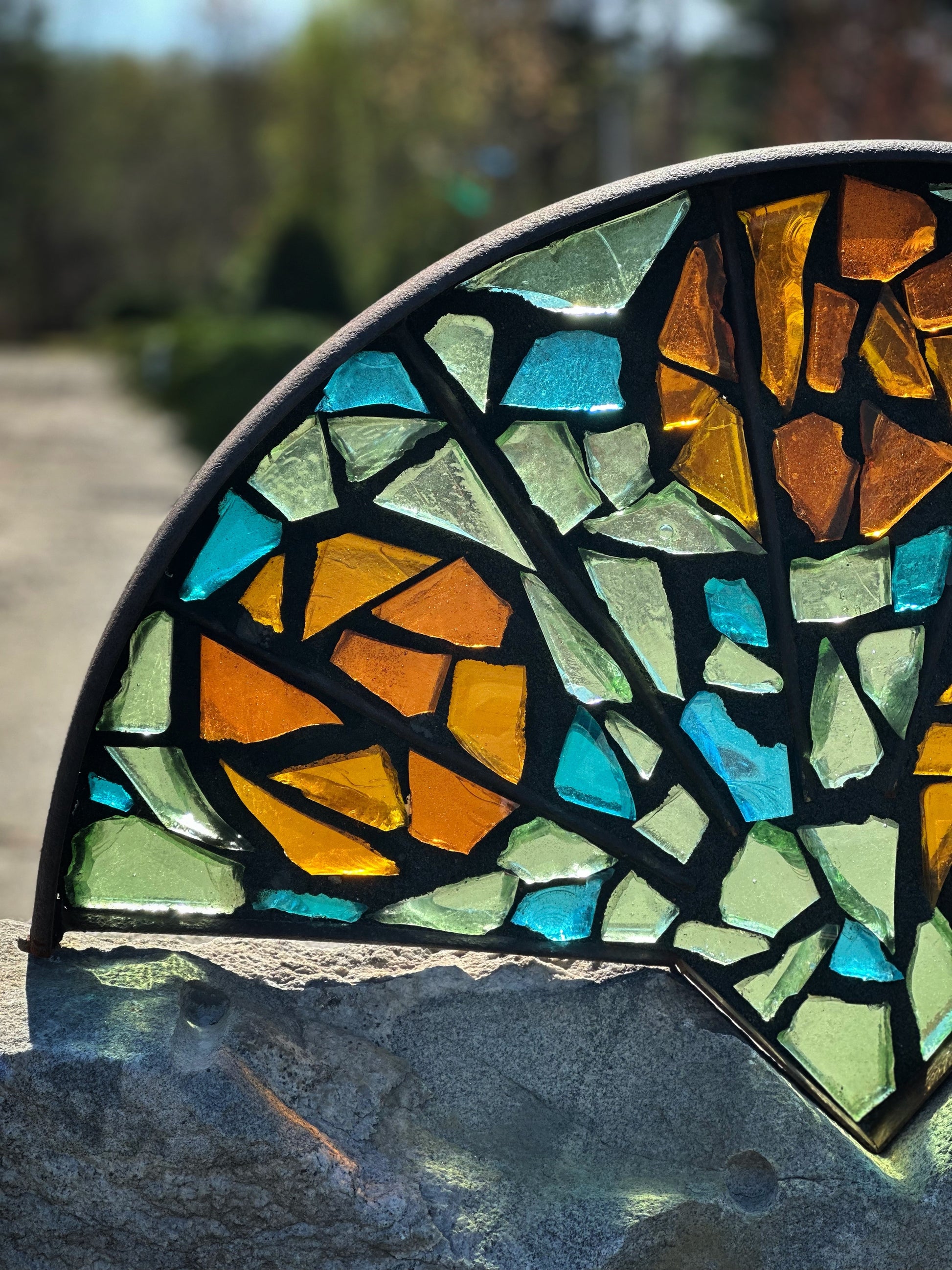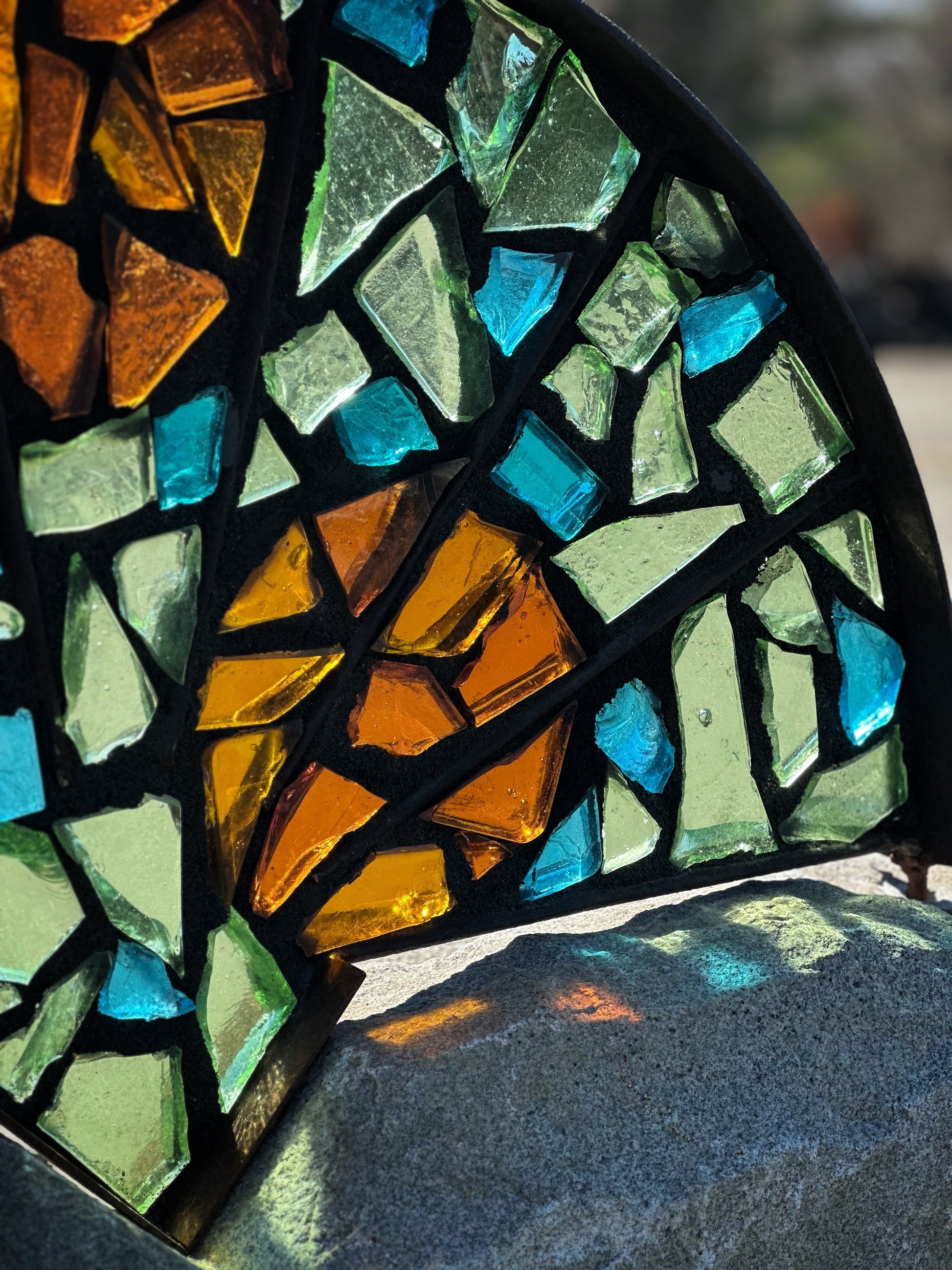 Half of an antique stone mill wheel embellished with multi-color dalle de verre art glass in a custom frame made of vintage steel, additional antique wheel serves as stand