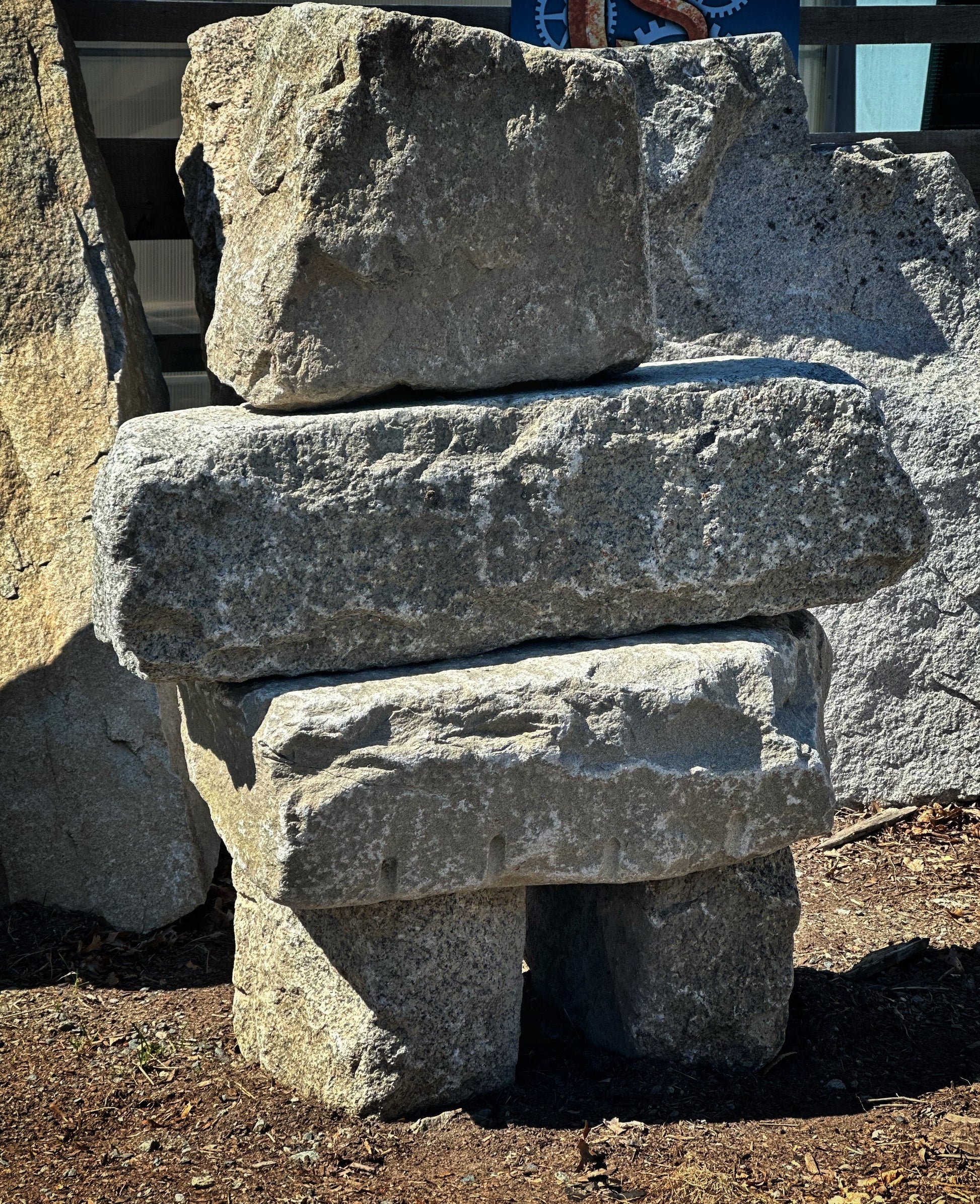 Reclaimed granite wayfinder sculpture inspired by traditional inukshuk stone formations